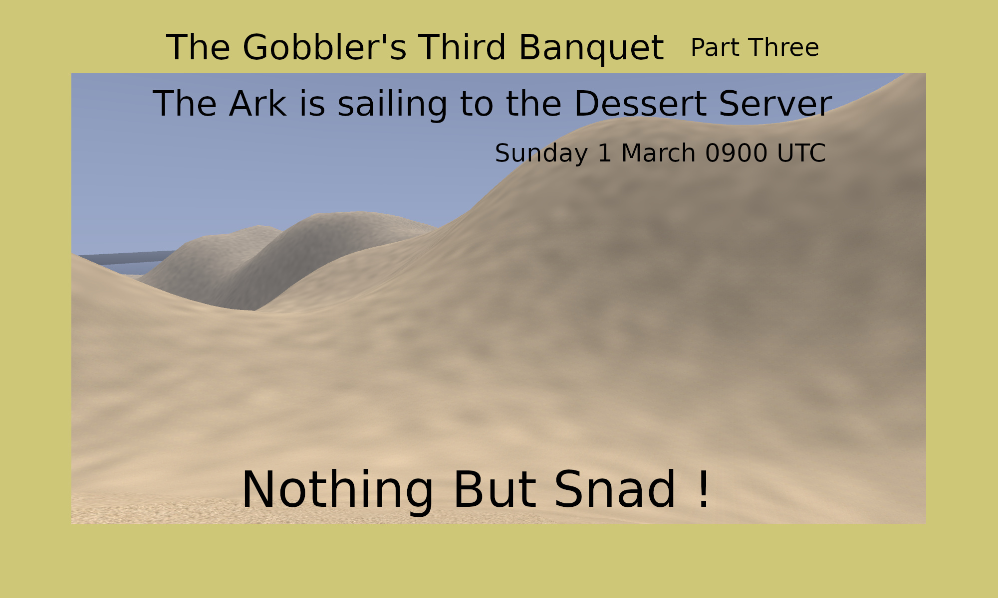 Weather reports of deluges of rain are forecast. However, the Ark is well loaded and ready to sail. Our journey to the Dessert Server will commence on first March at 0900 UTC (8pm AEDT). It is rumoured that the flood will be so great it will effect the land, turning all the soil into sand, except for some which lies under the water.