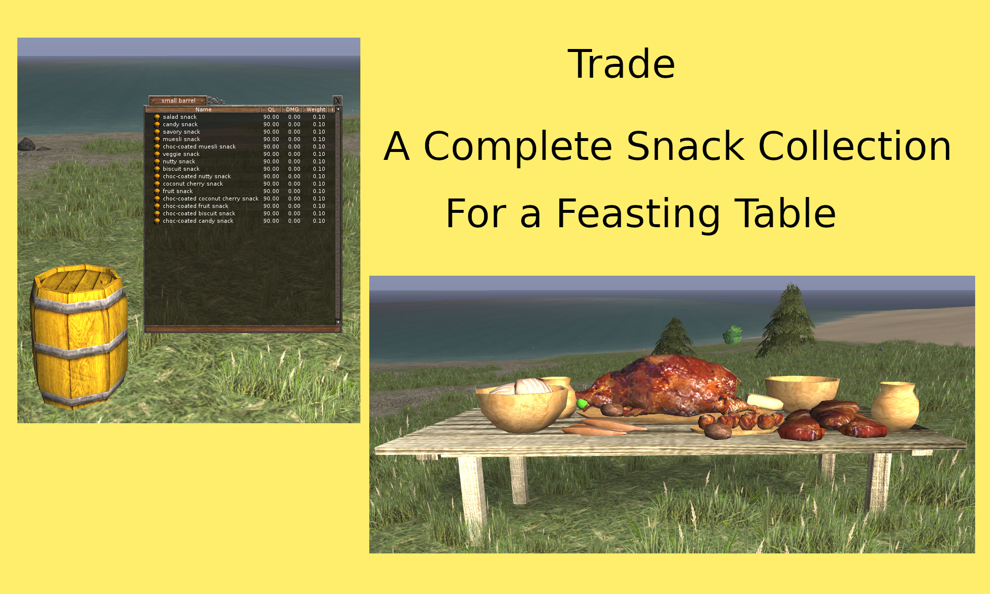 Preparation for future Ark journies from the Entree server to Main Course, and then from the Main Course to Dessert servers will be undertaken by the players. The list of items which will be available to be searched for will be taken from the item types packed into the Ark. In theory it will work out that a slightly easier start in the new lands will be possible if items have been packed to assist the start. Players may choose to not search the Ark and experience the increasingly difficult starting conditions. Players may search the Ark regardless if they packed any items or not. If an item is really wanted it will be a good idea to pack some in case nobody else has packed any. Players may inspect the contents of the Ark. Donations may be removed from the Ark each day up to each 8 pm Australian Time. After that time the donations are not retrievable.